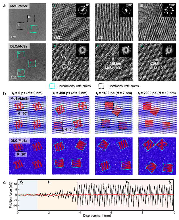 超润滑工程尺度实现面临三大核心挑战,即大尺度接触面的随机无序性导致超润滑失控、高接触压力下界面形变导致超润滑失效、大气环境活性气氛引发界面摩擦化学反应导致超润滑失稳。针对上述挑战,研究团队从“宏观接触-微纳界面-分子构型-原子晶格”跨尺度结构进行逐级设计。首先,基于归一化接触思想,通过激光织构构建规则的接触阵列,将宏观面接触归一化为无数等同的微米级单元接触,使每个单元的接触状态(面积、形状、 受力等)保持一致,这样界面润滑材料在同一接触状态下结构变化也趋于一致,整体变得可控(图1);其次,在每个接触单元表面构筑刚性非晶类金刚石碳(DLC)膜层/柔性晶体MoS2配副滑移元界面,刚柔结合有力削弱接触界面在极端高接触压力下的形变;进一步采用MXene作为增强与锚定剂,使晶体MoS2在极端高接触压力和大气环境下保持完整的层状结构,减少了缺陷与边缘的不利影响,赋予其抵抗水分子和氧气氧化能力,从而维持超润滑界面的稳定。最后,揭示了运动过程中原子晶格匹配的动态偏转微观机制(图2),即非公度态向公度态转化,发现了非晶DLC/晶体MoS2永久非公度接触特性,从根本上消除了晶格匹配所导致的原子互锁。