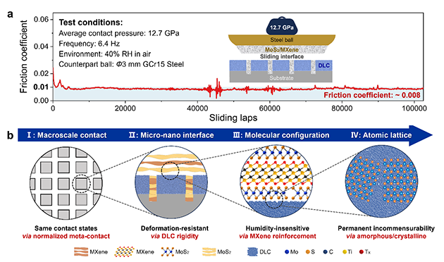 相关研究成果以“Engineering-Grade Macroscale Superlubricity Under Ultrahigh Contact Pressure in Atmospheric Air via Multiscale Synergistic Meta-Interfaces”为题发表在Advanced Materials(https://doi.org/10.1002/adma.202520241)上,兰州化物所王婉博士和武汉大学丁子峻博士为论文共同第一作者,兰州化物所吉利研究员、李畔畔助理研究员和武汉大学欧阳稳根教授为共同通讯作者。